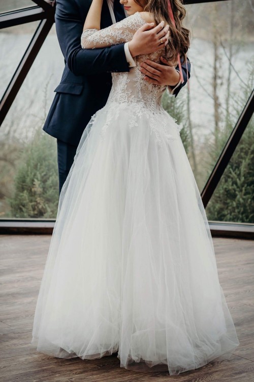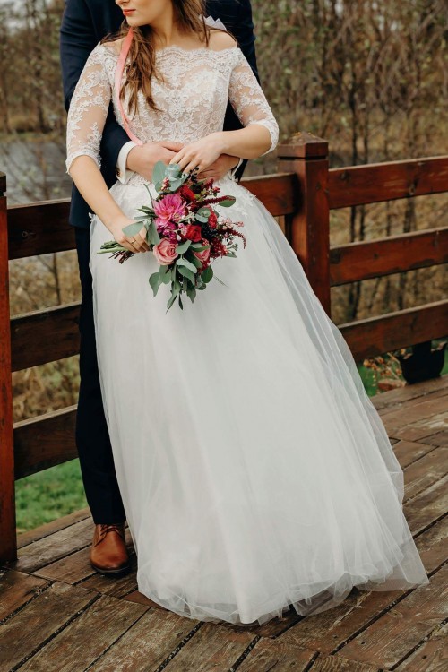 Sprzedam przepiękną suknie ślubną, kupiona była w salonie w Poznaniu za 3500, jest to rozmiar S/M. Można regulować ją za pomocą wiązań z tyłu, są one pod ozdobnymi guzikami. Ma wszyte wkładki, wiec nie potrzeba zakładać biustonosza. Na zdjęciach sukienka bez dodatkowego koła, ale dla zainteresowanych mam też zdjęcia z nim. Cały dół jest „obsypany” mieniącymi się drobinkami. W gorsecie wszyty jest beżowy materiał, dzięki czemu jest idealna na sezon zima-wczesna wiosna. Mój wzrost 164+ 12cm obcas