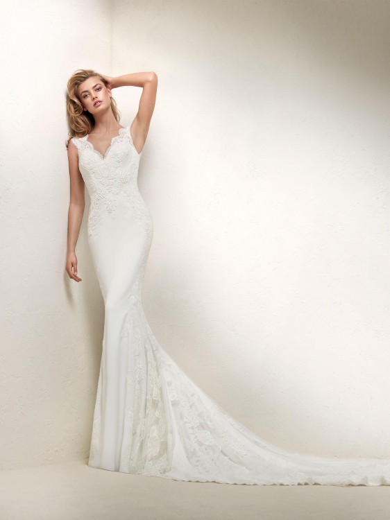 Główne zalety tej oryginalnej sukienki to aplikacje z koronki oraz kamieni. Suknia o kroju syreny wraz z trenem. Suknia jest w bardzo dobrym stanie, idealnie podkreśla figurę, jest bardzo wygodna i nie krępuje ruchów. Sukienka ubrana tylko dwa razy: na ślub oraz sesję.