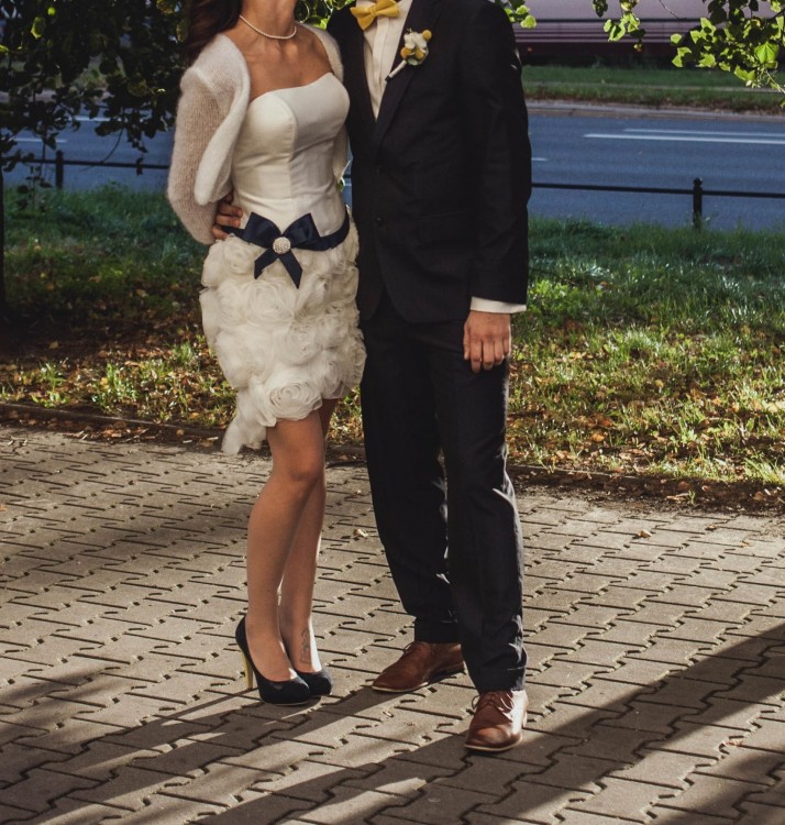 Sukienka w kolorze białym z granatowym paskiem ozdobionym kamieniami podobnymi do cyrkonii.