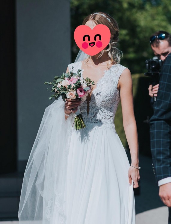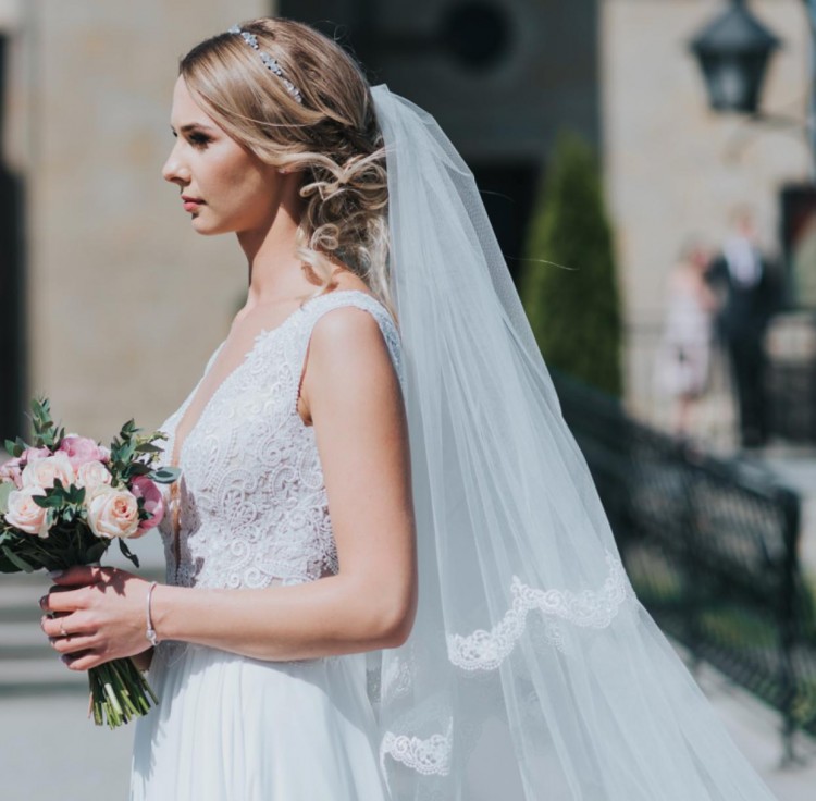 Sukienka Ślubną „Laura” z kolekcji 2018 wraz z długim (2,5m) zdobionym welonem, zakupioną w Salonie Sukni Ślubnych Madonna