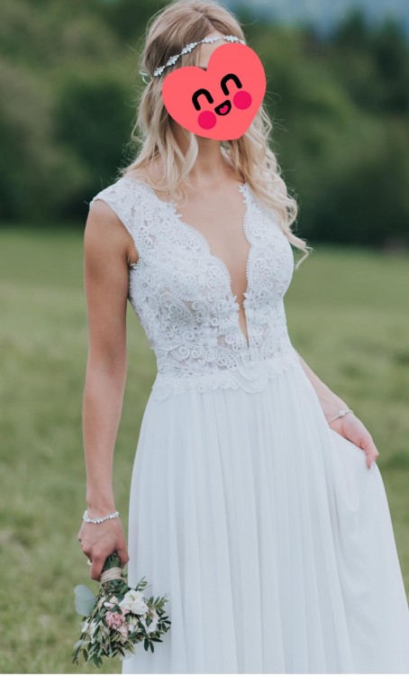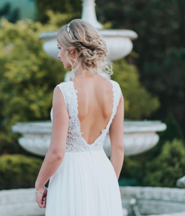Sukienka jest wykonana z wysokiej jakości gipiury oraz muślinowego dołu, na prawej nodze posiada rozcięcie sięgające do połowy uda, plecy odkryte , z tylu zamek.