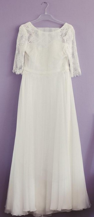 Góra sukni wykonana z bawełnianej koronki we wzory geometryczne. Wszyty jest cienki gorset, kształtujący biust i brzuch, jednak nie krępujący ruchów. Tył sukienki ma wycięciem w kształcie litery V eksponującym plecy, rękawy do łokci. Dół sukienki z lekkich materiałów; miękka satyna, muślin, jedwab.