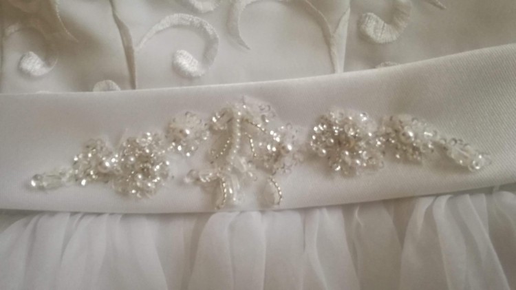 Góra to zdobiony gorset wiązany z tyłu (możliwość regulacji - indywidualnego dopasowania). Sukienka posiada pasek z ozdobnymi perełkami-kryształkami z przodu, który z tyłu jest zakończony kokardą. Pasek może być odczepiony (jest zapinany na niewidoczny guzik od wewnątrz). Od pasa w dół jest tiul. Sukienka jest pięknie rozkloszowana - ładnie w tańcu wiruje.