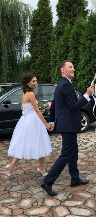Polecam wszystkim Pannom Młodym, które chcą się wyróżniać, cenią sobie wygodę i lubią wyeksponować ładne buty (ja miałam szpilki w kolorze perłowego różu). Dzięki sukience zebrałam mnóstwo komplementów - nasi goście mówili, że nie wiedzieli że krótka sukienka ślubna może tak pięknie wyglądać.