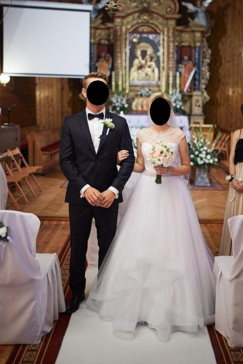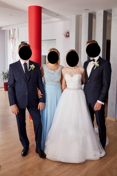 Sukienka w rozmiarze 34/36 wzrost ok. 160cm +9 cm obcas. Kolor biały. Do sukienki jest osobno koszulka, którą widać na zdjęciach. Suknia posiada dodatkowo halkę z kołem, które można zwiększyć lub zmniejszyć. Mam do sprzedania również buty firmy Kotyl rozmiar 36. Również na sprzedaż mam błękitną sukienkę, którą miała moja mama. Cena do negocjacji
