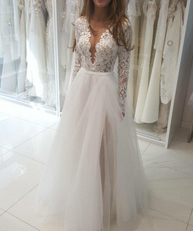 Sukienka ślubna z długim rękawem i esami floresami