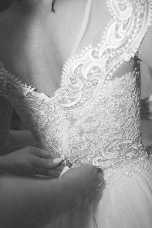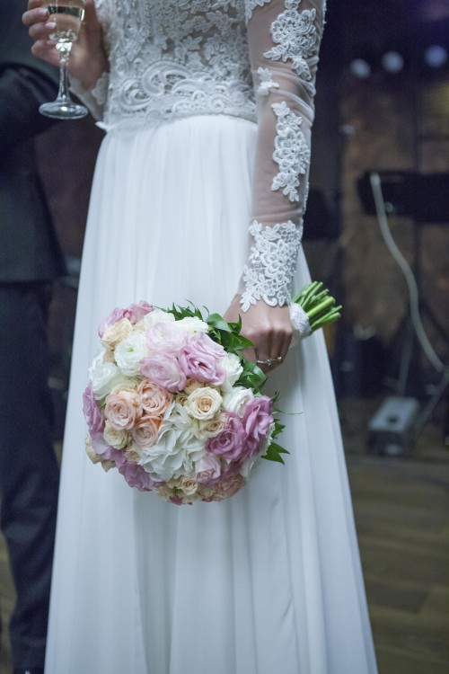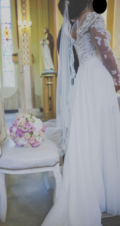 Góra haftowana ręcznie w modne, solidne koronki, dół muślinowy z podpinanym trenem, bez koła.