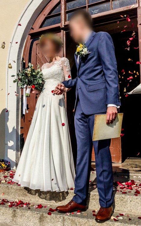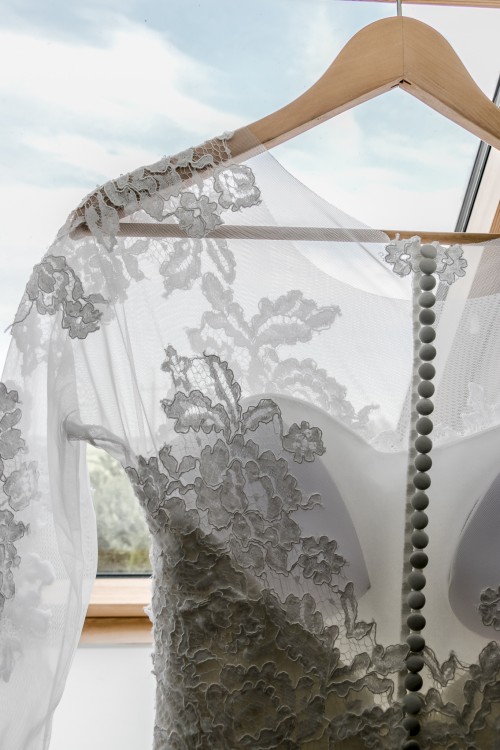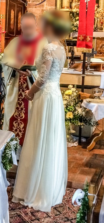 Sukienka ecru. Lekka, zwiewna. Dół z muślinu, natomiast góra z tiulowym rękawkiem, wyszywanym koronką. Na tułowiu, sukienka ma wszyte delikatne cekiny i koralik, które dodają jej delikatnego blasku. W odróżnieniu od sukienki na zdjęciu producenta, moja nie ma trenu. Jest delikatnie wydłużona z tyłu i lekko opada.