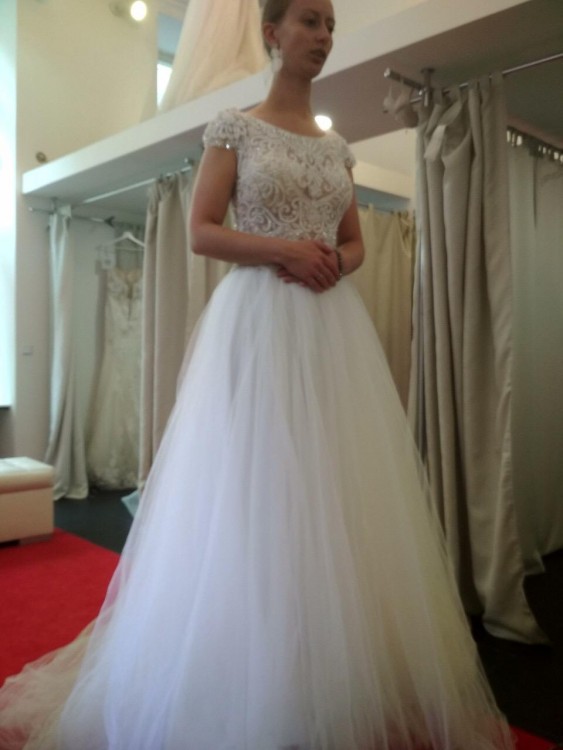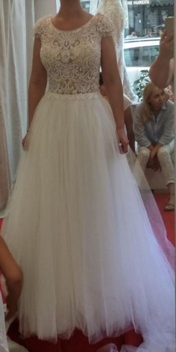 Suknia w kolorze IVORY, zdobiony koralikami piękny gorset i plecy. Suknia jest bardzo biżuteryjna, pięknie wygląda, jest zdobiona, ale jednocześnie skromna. Długi tren, podpinany na 5 guziczków.