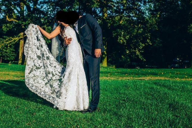 Suknia jest w rozmiarze 36/38, wzrost +/- 168cm + obcas. Dodatkowo dorzucam bolerko, które zostało założone tylko w drodze do Kościoła oraz welon bardzo ładnie zdobiony.