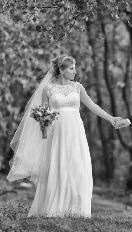 Suknia o fasonie litery A. Góra sukni wyszywana gipiurą oraz koralikami, dół wykonany z lekkiego, zwiewnego muślinu. Wycięte plecy w kształt litery V, zapinana na suwak. Dodatkowo wykonany pasek, który można odpiąć bądź jeszcze bardziej wyeksponować wyszywając kamieniami lub dopinając broszkę. Suknia profesjonalnie uszyta z siedmiu warstw materiału (dwie wierzchnie muślinowe), nie wymaga halki, pięknie się układa.