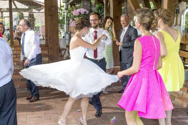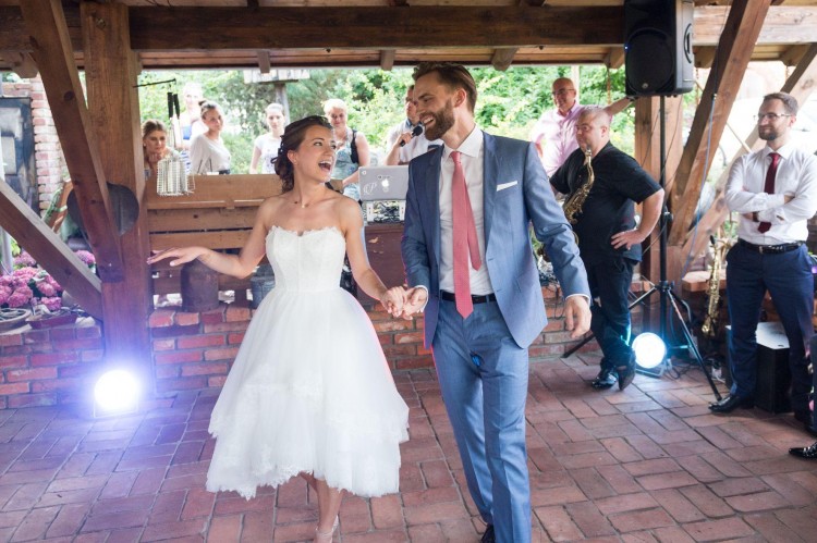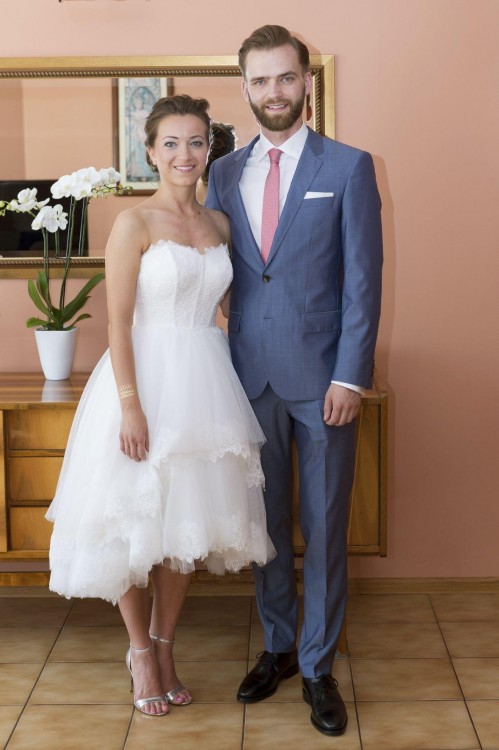 Gorset ozdobiony delikatną koronką, zapinany z tyłu na zamek błyskawiczny. W środku gorsetu wszyty stelaż, także mimo sporych rozmiarów biustu, wszystko trzymało się na swoim miejscu. Dół sukni składa się z kilku warstw tiulu zakończonych koronką. Suknia jest z przodu krótsza, z tyłu dłuższa. Oryginalnie była jeszcze dłuższa z tyłu, ale ją skróciłam, i nie żałowałam bo miałam wesele na dworze, akurat gdy były upały 40 stopniowe. Sukienka sprawdziła się perfekcyjnie, czułam się w niej lekko, wygodnie, nie byłam uzależniona od nikogo np. z chodzeniem do toalety.