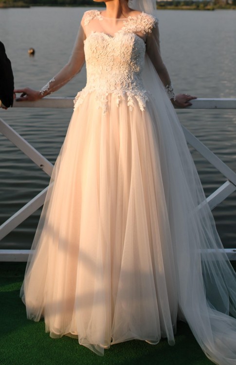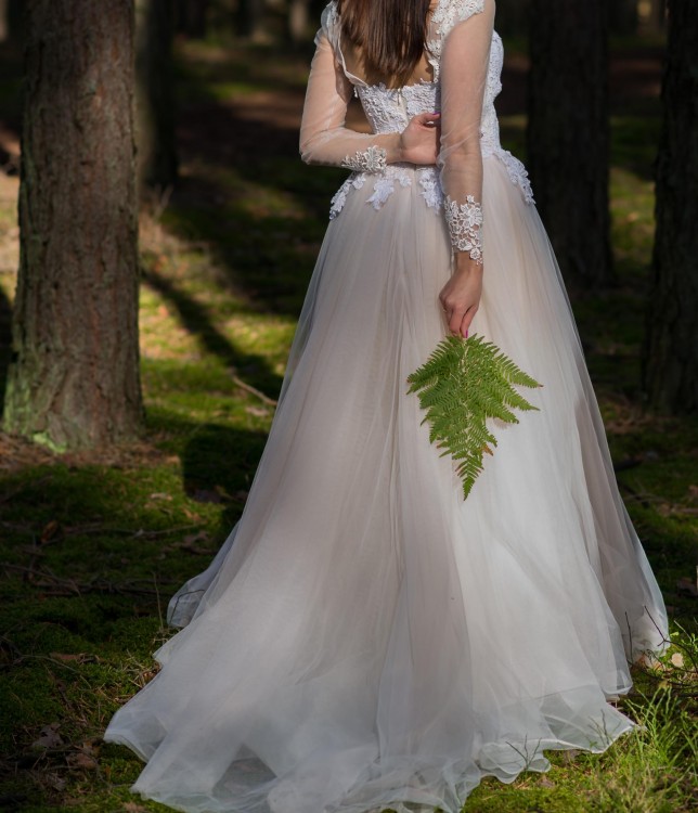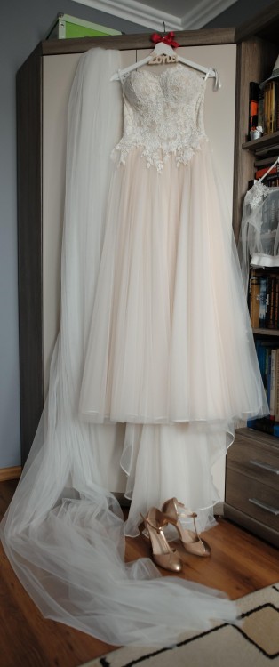 Na sprzedaż piękna,zwiewna suknia Andromeda. Rozmiar S/M. Uszyta na wzrost 169 + 7 cm obcas. Suknia w kolorze szampana z podpinanym na guziczek trenem. Bardzo wygodna i pięknie układa się w tańcu. Bolerko gratis.