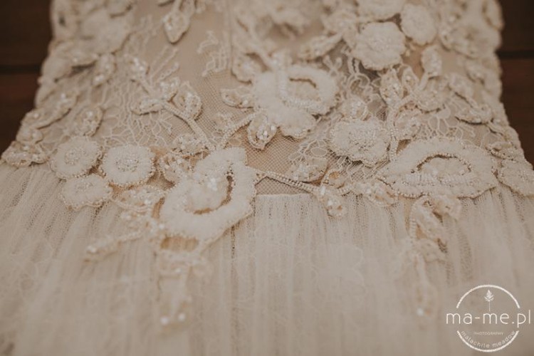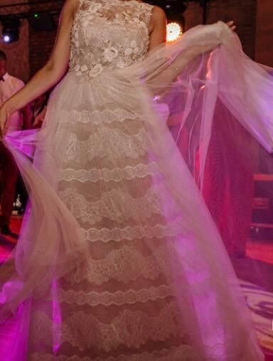 Suknia została zakupiona w salonie Pronovias w Warszawie. Wykonana w Barcelonie - ręcznie, z najwyższej jakości koronek. Dolna część sukni uszyta jest z kilku warstw, które w całości tworzą piękny wzór. Posiada również kieszonki :) Rozmiar 34/36, dopasowany do wzrostu 1,69m plus 8,5cm obcas.