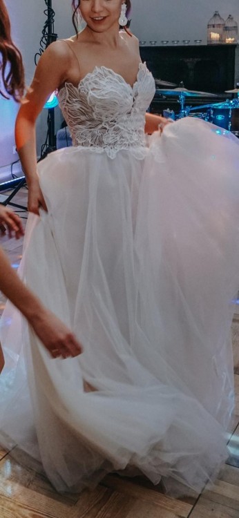 • Dół sukni: 7 warstw zwiewnego lekkiego tiulu, w tym 3 w kolorze cielistym z koronkowymi akcentami motyla.