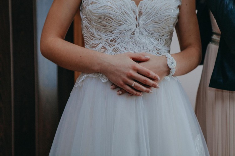 • Góra sukni: delikatna, koronkowa w kształcie skrzydeł motyla na cielistej, niewidocznej siateczce. W biuście wszyte są poduszeczki stanika, które zapewniają komfort poruszania się. Suknia zapinana z tyłu na suwak, plecy wycięte w literę V.