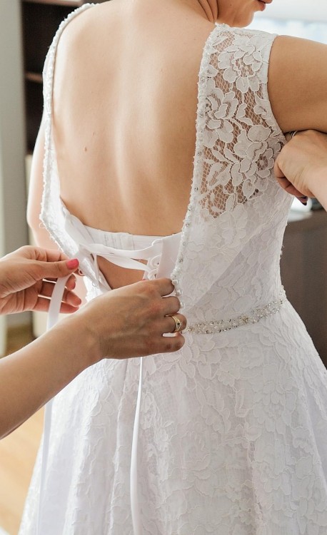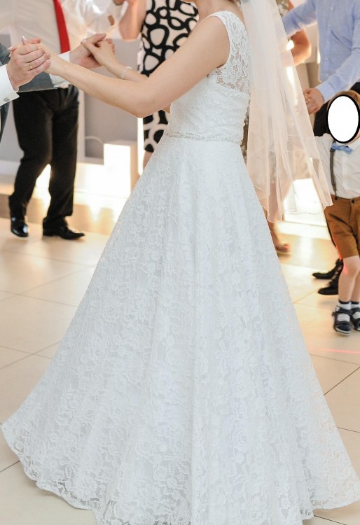 Suknia Anna z salonu Diana w Rzeszowie, cała koronkowa w kolorze białym, zapinana z tyłu na guziczki perełkowe pod spodem wiązana na gorset dzięki czemu można ją dopasować do figury, długość sukni 117 cm (szyta na wzrost 173 + 2 cm obcas). Gratis do sukni welon obszyty kamyczkami takimi samymi jak przy sukni. Polecam i zapraszam do kontaktu.