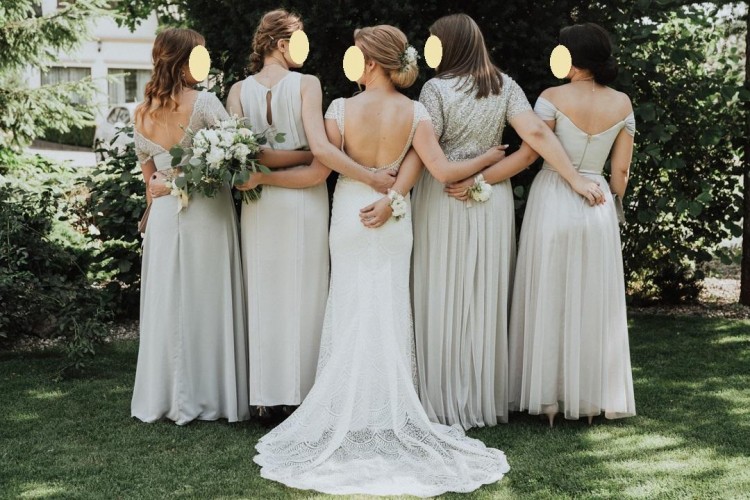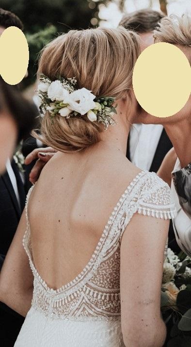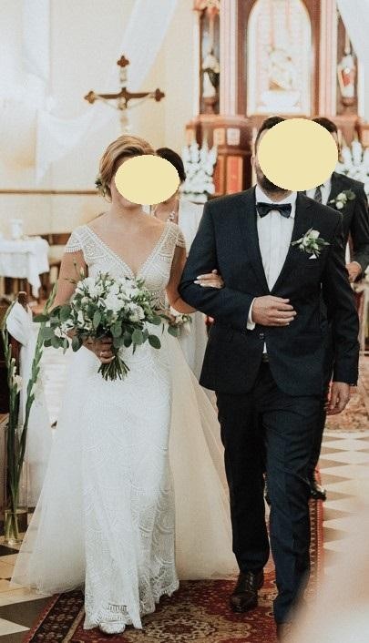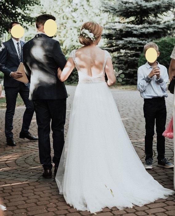 Suknia jest w całości koronkowa, posiada podczepiany koronkowy tren. Dodatkowa ma doczepiany na zatrzaski tiulowy tren katedralny, długości 2 m. Suknia ma wszyte miseczki w rozmiarze C, które łatwo można wymienić na inny rozmiar. Góra sukni jest uszyta na cielistej siatce, co daje pewność że suknia się nie zsuwnie i nie przemieszcza w trakcie tańca. Suknia ma głęboko wycięty dekolt na plecach. Posiada jedną podszewkę, dlatego jest lekka i wygodna.