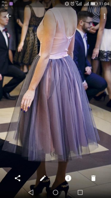 Mam do sprzedania piękną delikatną suknię długości 3/4. Wygląda bardzo kobieco i elegancko. Lekki dół z tiulową wartwą nadaje jej wieczorowy wygląd.