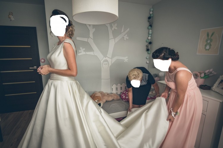 Zachęcam do zakupu. Suknia jest perfekcyjnie wykonana z przepięknego materiału mikado, który pięknie się układa i nie gniecie. Zakupiona w sierpniu w salonie Angela w Grudziądzu. Szyta specjalnie na mój wzrost 182. plus 7 cm. obcas. Suknia jest wiązana a potem zapinana na suwak, co sprawia, że pasuje od rozmiaru 38 do 42. Posiada wszyty gorset i miseczki dzięki czemu IDEALNIE się dopasowuje( brak biustonosza) oraz dyskretne kieszenie na np. chusteczkę. Suknia posiada wszystkie halki wraz z kołami. Zapewne można ją skrócić, choć z doświadczenia wiem jak ciężko jest znaleźć suknie będąc wysoką. Do sukni dokładam tren, który niewątpliwie dodaje sukni uroku. Dzięki odpinaniu go nie przeszkadza w zabawie. Suknia ubrana była tylko na ślubie kościelnym bez wesela i zdjęciach. Więcej zdjęć chętnie podam na priv. Polecam i zachęcam do kontaktu i przymiarek.