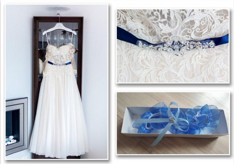 Halka wraz z kołem oraz nowa nieużywana podwiązkowa w kolorze niebieskim również są dołączone do sukni.