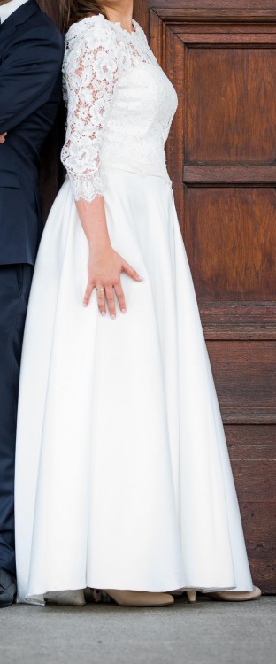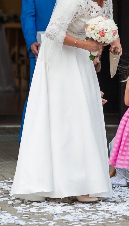 Jest koloru ecru w rozmiarze 38; na wzrost 173cm+3cm obcas, materiał mikado, tył sukni jest kilka cm dłuższy,