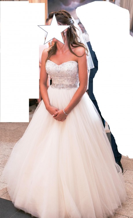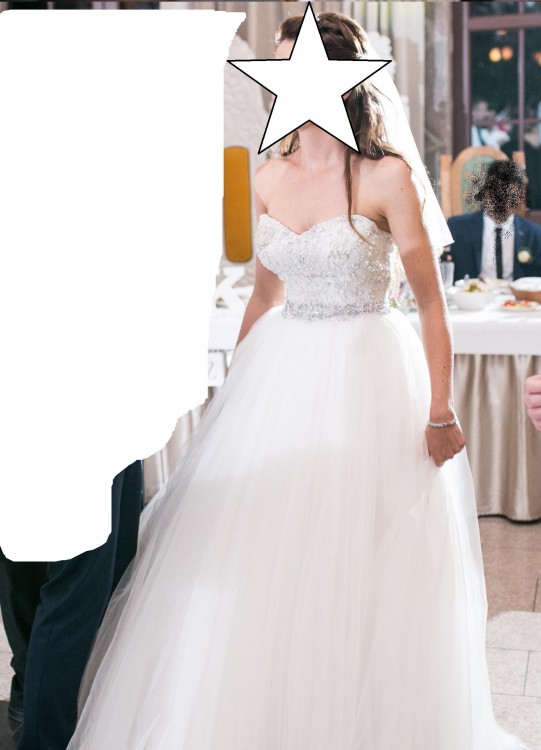Sprzedam zjawiskową suknię ślubną marki Justin Alexander model 8724. Kolor pearl/silver (śmietankowa biel). Gorset typu serduszko z jedwabnej koronki, ręcznie zdobiony kryształkami Swarovskiego i perełkami. Tył wycięty w kształcie litery V, zapinany na zameczek zakamuflowany pod eleganckimi guziczkami. W gorsecie wszyta jest szeroka guma doskonale podtrzymująca suknię na sylwetce. Dół w stylu księżniczki, wykonany z wielu warstw tiulu (bardzo dobry gatunkowo - nie gniecie się i nie elektryzuje, bardzo dobrze układa się w tańcu). Suknia bez trenu.