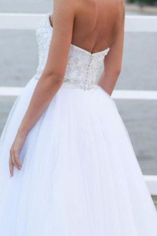 Gorset sukienki zdobiony jest pięknie mieniącymi się kamieniami Swarovskiego i perełkami, które są ręcznie wszyte, niedoklejane.