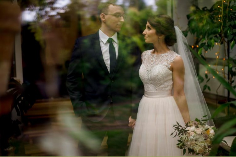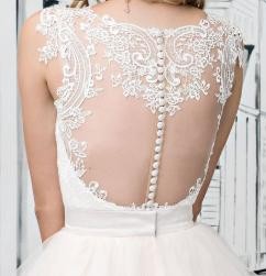 Koronkowy gorset z dekoltem w łódkę z pięknie odkrytymi plecami (koronka na niewidocznej siateczce). Spódnica w lekko brzoskwiniowym odcieniu, która dobrze podkreśla talię. Suknia świetnie układa się w tańcu i jest bardzo wygodna.