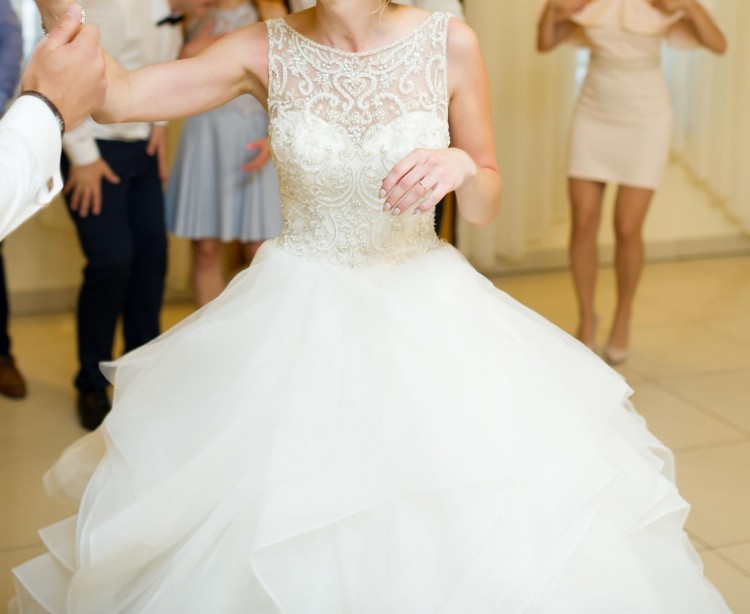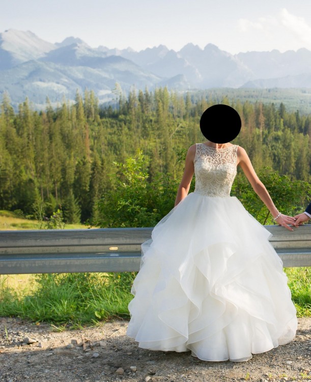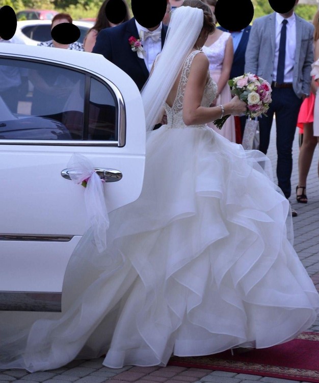Suknia posiada efektowny tren, model ten jest bardzo oryginalny i unikatowy. Suknia przepięknie prezentuje się w tańcu, dzięki rozłożystości falban. Wykonana jest z wysokiej jakości materiału. Suknia ta zrobiła ogromne wrażenie, na wszystkich gościach. Bogate zdobienia na gorsecie dodają jej blasku, a pięknie wycięty dekolt na plecach dodaje sukni pazura. Bardzo żałuje, że nie będę mogła założyć jej po raz kolejny! Gorąco polecam! Gratis dorzucam welon do ramion w tym samym odcieniu (ivory). CENA DO NEGOCJACJI! Suknia nie posiada koła. Od wewnątrz zastosowany jest gumowy pas, dzięki któremu suknia super trzyma się na sylwetce. Oczywiście suknia jest oryginalna(posiada certyfikat o oryginalności). Suknia ta również odegrała główną rolę w programie tvn style. Cena katalogowa 6290zł. Możliwość przymiarki w Głogowie Młp.