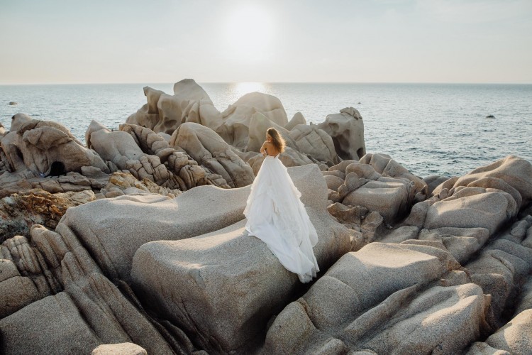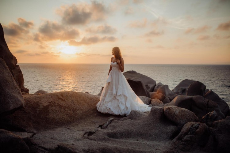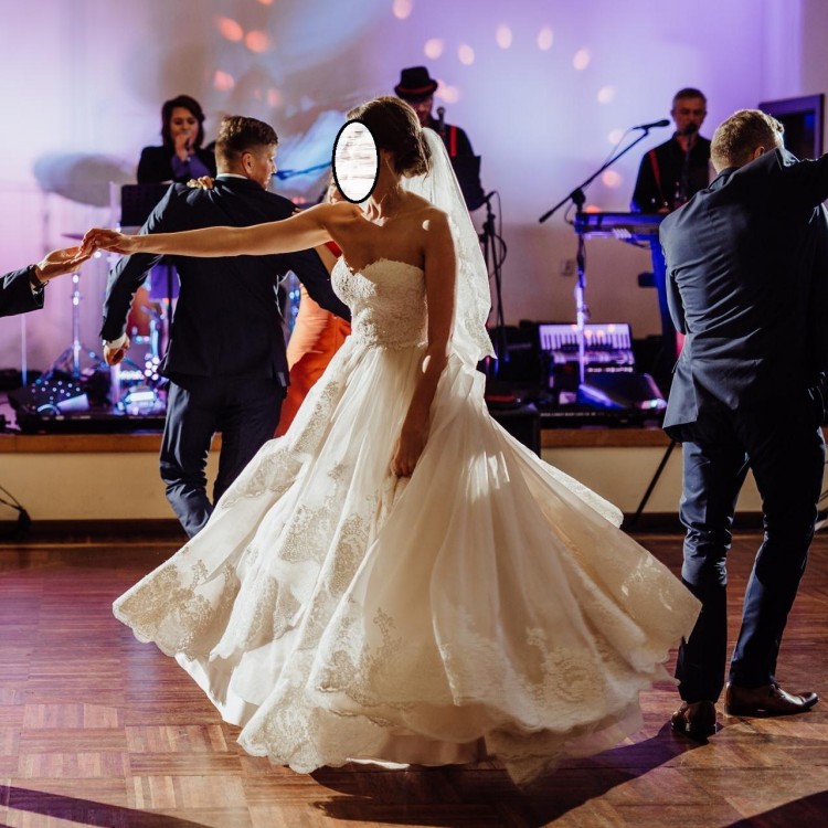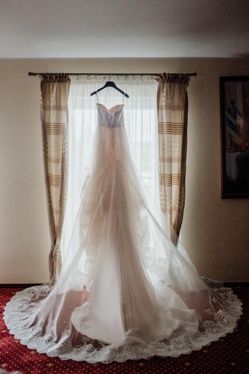 Suknia Justina Alexandra z kolekcji zimowej 2017/2018. Suknia po krawieckich przeróbkach, posiada odpinaną spodnią część trenu na rzepy. Wierzchnia część (cieńsza) ma możliwość przypięcia na guziki do talii, guziki ukryte są w ozdobnych haftach. Dzięki temu rozwiązaniu suknia nie przeszkadza podczas zabawy weselnej i jest dużo lżejsza. W gorsecie zostały przyszyte miseczki zamiast stanika. Sama suknia nie „zsuwa” się z biustu, jest zabezpieczona wszytymi silikonowymi wstawkami oraz dodatkowym pasem zapinającym w środku. Wbrew pozorom suknia jest lekka, zwiewna i bardzo wygodna.