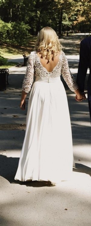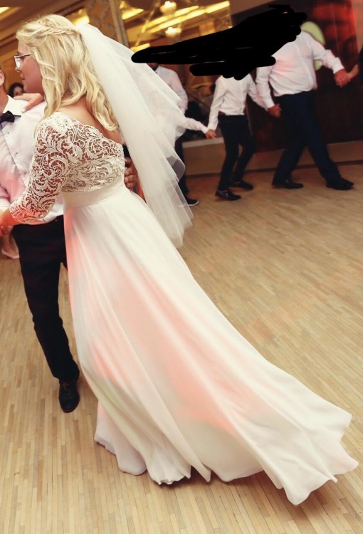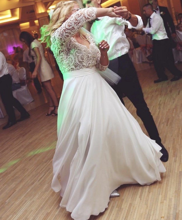 Suknia ma rękaw w długości 3/4 i pięknie wycięte plecy (szpic). Dół posiada kilka muślinowych warstw, które cudownie układają się w trakcie tańca. Jest bardzo lekka i niesamowicie wygodna.