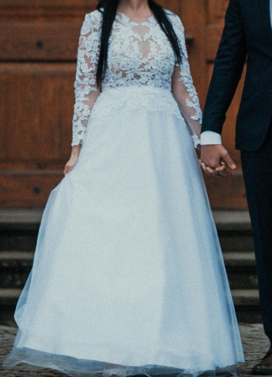Biała suknia ślubna - bardzo wygodna z długim rękawem, modny krój, doskonale leży i nie uwiera. Góra sukienki cała w koronce. Z przodu wszyty "półgorset" w kolorze cielistym - rozmiar miseczki "C". Spód sukienki - składa się z warstw tiulu - nie ma "koła" przez co jest dużo wygodniejsza. Tył sukni zapinany na "niewidzialny" zamek.