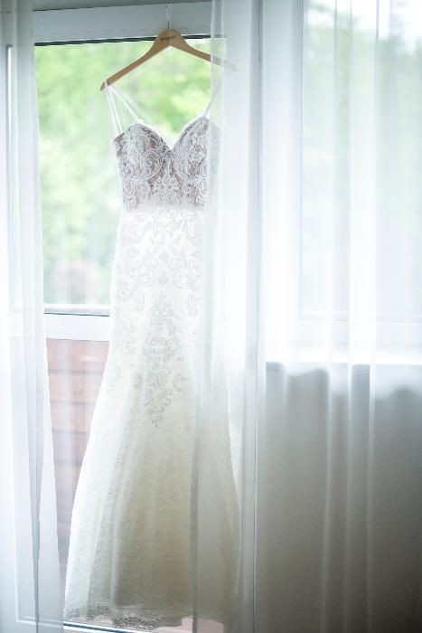 Przepiękna suknia ślubna kupiona w salonie Madonna w Krakowie z kolekcji z 2017 r. o fasonie syreny. Suknia w całości wykonana jest z koronki, a gdzieniegdzie ozdobiona koralikami. Posiada długi tren, który wygląda niezwykle efektownie. Suknia ma w całości odkryte plecy. Z tyłu częściowo zapinana jest na zameczek, a częściowo na ozdobne, delikatne guziki. Suknia jest dopasowana idealnie do sylwetki - nosi się ją jak drugą skórę. Cudownie wygodna i pięknie wygląda w tańcu. Sukienka wymaga odświeżenia w przypadku zainteresowania cena do uzgodnienia. Rozmiar jaki noszę to M (10), jednak suknia była dopasowana do moich rozmiarów i może trochę się różnić od typowego M. Suknia uszyta na wzrost 168+szpilki 8cm cm jednak w każdej chwili można ją skrócić i dopasować do swojego rozmiaru. Za suknie zapłaciłam ponad 4000zł, a wystawiam za 2800 tylko ze względu na to, że była już noszona.