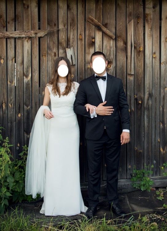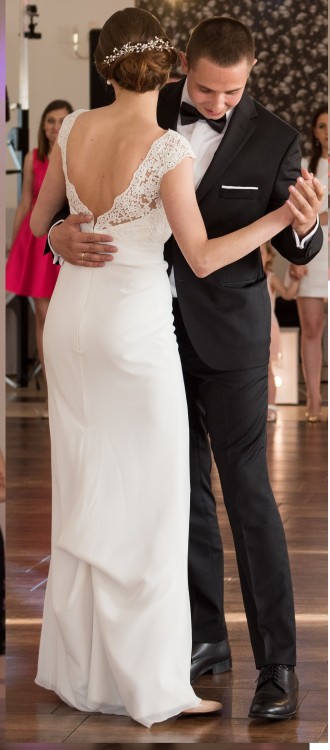 mam do sprzedania suknie ślubną z grupy Pronovias, kolekcja La Sposa, Jest to bardzo elegancka suknia dopasowana do figury, góra sukni z hiszpańskiej, bawełnianej koronki, talię podkreśla drapowany pas, dół sukni z warstwy muślinu. Suknia jest lekka i bardzo wygodna.