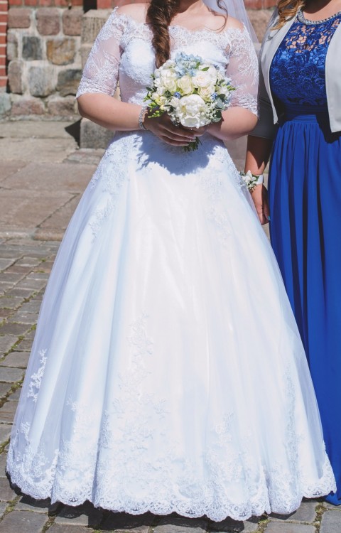 Sprzedam przepiękną suknię ślubną z tegorocznej kolekcji 2017 - Lavare z firmy Amy Love. Zamawiana w rozmiarze 7, dopasowywana na wzrost 164 cm + 6 cm obcas. Gorset usztywniany, posiada wszyte fiszbiny. Będzie pasowała na Panią noszącą rozmiar 38-40. Suknia posiada możliwość regulacji szerokości talii - trójstopniowy pas. Kosztowała w salonie 3420 zł, bolerko 390 zł, welon 210 zł, plus koło 150 zł razem 4170 zł. Sprzedaję wszystko za 1800 zł. Cena do negocjacji. Suknia posiada przepiękny tren, który można upiąć, a także dopinane warstwy tiulu pod spodem, które można usunąć, by uzyskać efekt lekkiej mgiełki. Przepięknie wygląda w tańcu, cudownie się kręci oraz mieni ze względu na kryształki, którymi jest wyszyta. Jest zapinana z tyłu na zamek i guziczki. Dołączam gratis bolerko (3/4 rękawka, hiszpański styl, odkryte ramiona, który dodaje uroku całości), halkę na kole oraz welon do łokci, obszywany ręcznie kryształkami. Wszystko po czyszczeniu w pralni chemicznej, odświeżone. Zapraszam do przymiarki w Szczecinie i zachęcam do kupna. :)