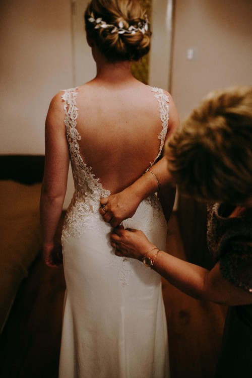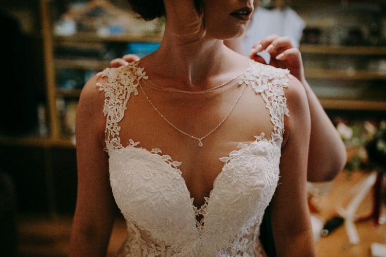 Szyfonowa suknia z koronkowym wykończeniem dekoldu i talii jest bardzo wygodna i świetnie układa się również podczas tańca. Posiada tren podpinany na guzik.