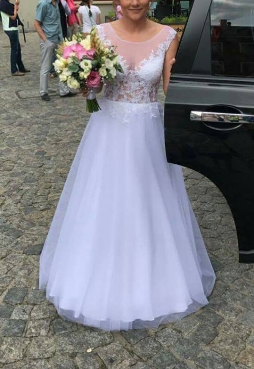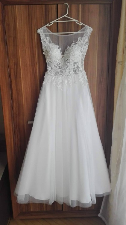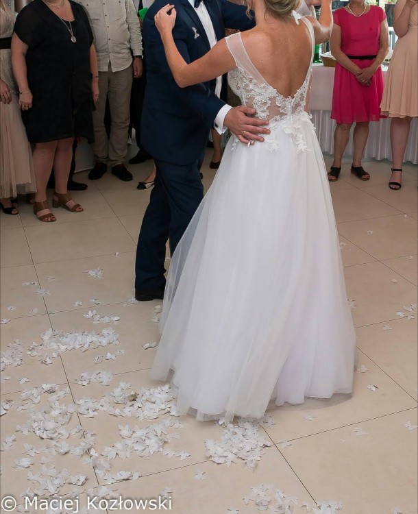 Suknia koronkowa z wysokiej jakości koronki ,dół muślin oraz dwie warstwy tiulu, tył plecy odkryte bardzo efektowne.Suknia na kole odpinanym, na wzrost 160+8cm obcas ,rozmiar 36.