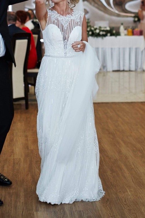 Witam, mam do sprzedania przepiękną suknie ślubną w kolorze ecru, cała zdobiona delikatną, a zarazem bogatą koronką. Bardzo wygodna i lekka. Została uszyta na miarę w Salonie sukni ślubnych IGAR w Rzeszowie. Rozmiar 34/36, długość sukni dla kobiet o wzroście około 162/164 cm, plus wysokość obcasa (9cm).