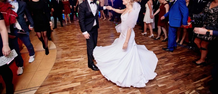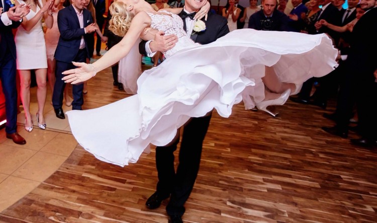 Suknia Posiada długi podpinany tren zupełnie nie przeszkadzał w tańcu.