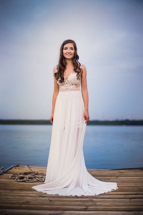 Tren podpinany na guziczek. Wszyte miseczki. Suknia zwiewna, lekka.
