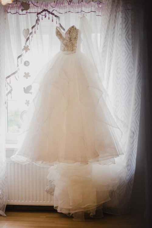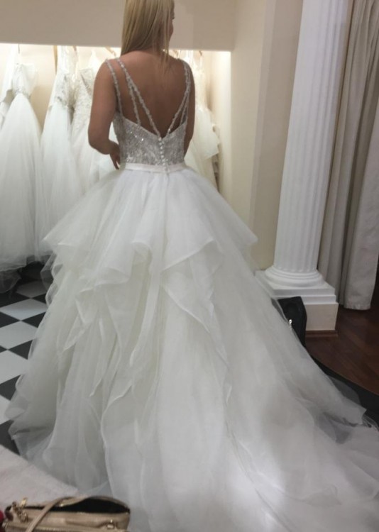 Przepiękny gorset z kryształkami, wysadzany kamieniami. Dół sukni składa się z falban. Tył sukni tworzy piękny tren.
