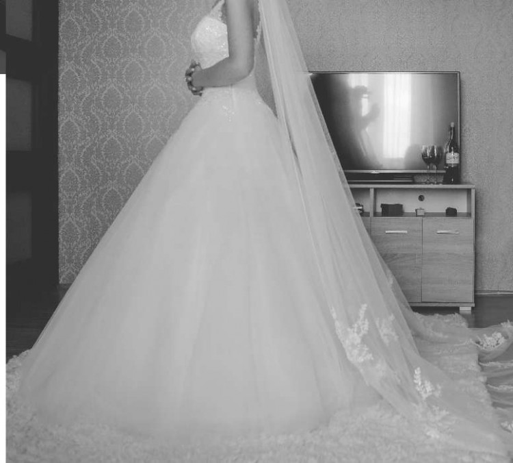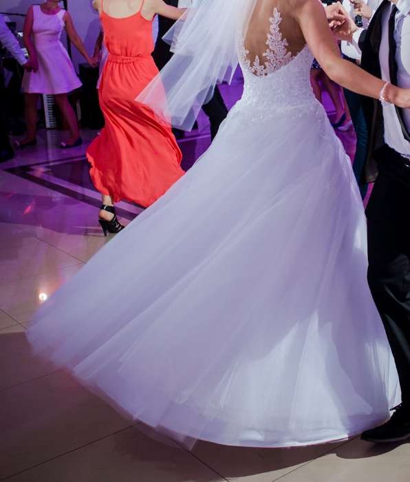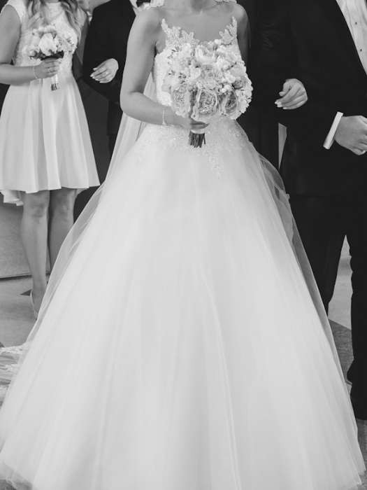 Suknia w kolorze czystej bieli, gorset zdobiony koralikami i cekinami, co daje przepiękny efekt podczas poruszania się. Dodatkowo na ramionach i plecach płatki koronki uszyte na cielistej siateczce w efekcie uzyskany tzw "efekt tatuażu".