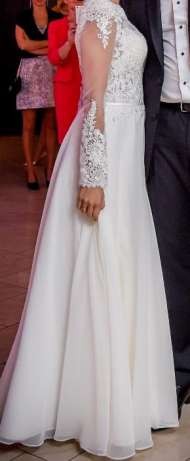 Suknia Ślubna Model Piwone rozmiar 34/36. Szyta na miarę w salonie firmowym Gala w Płocku. Mam 163 cm + 7cm obcas. :)