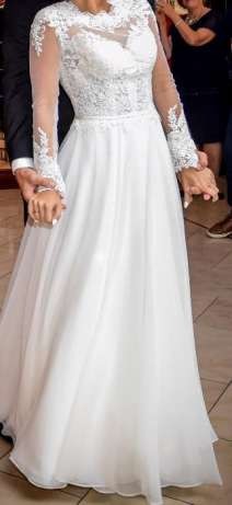 Suknia jest prosta, klasyczna, dzięki koronce prezentuje się obłędnie.