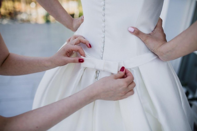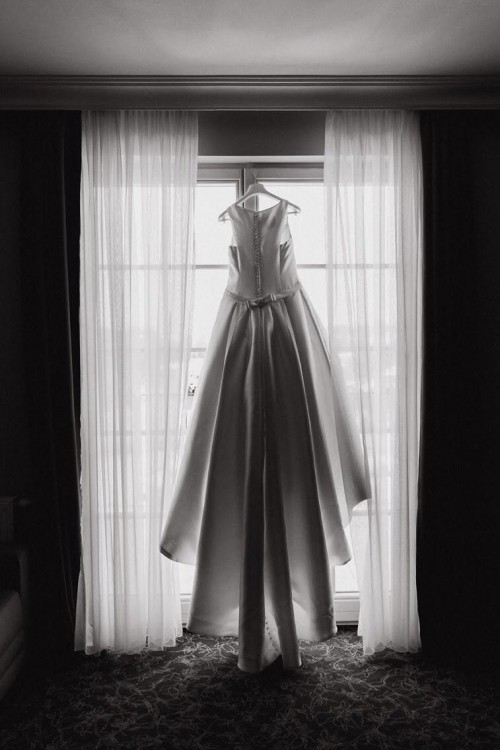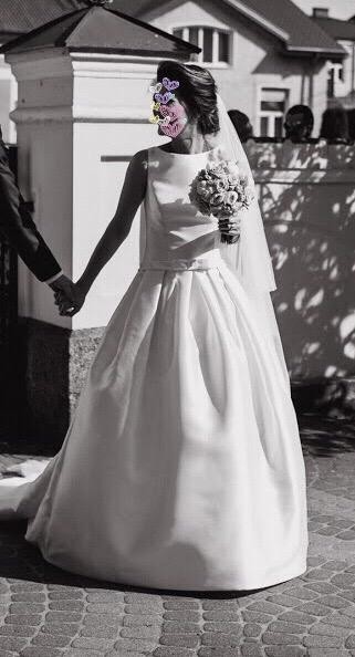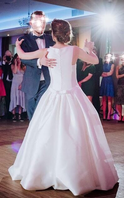 Suknia posiada tren, który potem można podpiąć pod suknie (specjalne haftki pod suknia) tak że nie traci swojego pięknego fasonu.