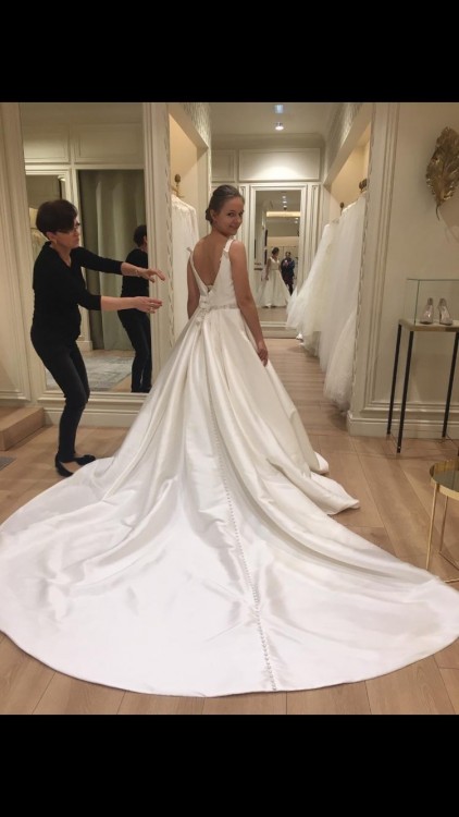 Zdjęcia są sprzed skrócenia, jednak suknia poprostu nie ciągnie się z przodu. Objętość sukni wynika z materiału, nie z wielkości halki :) jednak nie jest przy tym ciężka.