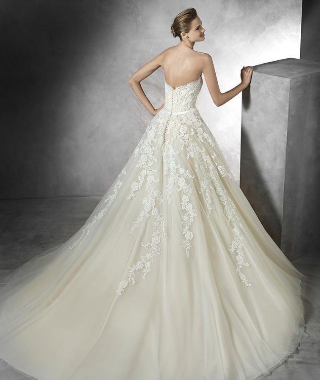 Model został sprowadzony z Hiszpanii na zamówienie. Sukienka jest w kolorze off-white (ivory), Jest duża, wytworna i wykonana z porządnych materiałów. Co Pronovias to Pronovias :)