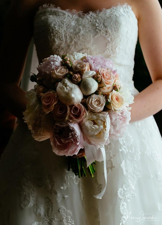Jeśli chodzi o samą suknię to: Gorset dobrze się trzyma, posiada wewnątrz szeroką gumę, która gwarantuje dobre dopasowanie. Góra sukni oraz spódnica przy pasie jest pokryta przepiękną, ręcznie zdobioną wysokiej jakości hiszpańską koronką,a sama spódnica jest złożona z wielu warstw tiulu i posiada tren podpinany na 3 małe guziczki. Tren nie przeszkadza w tańcu i zabawie, a podczas ceremonii oraz na zdjęciach robił ogromne wrażenie. Jakość tkanin i precyzja wykonania powodują, że w tym wyjątkowym dniu możesz poczuć się jak prawdziwa księżniczka.