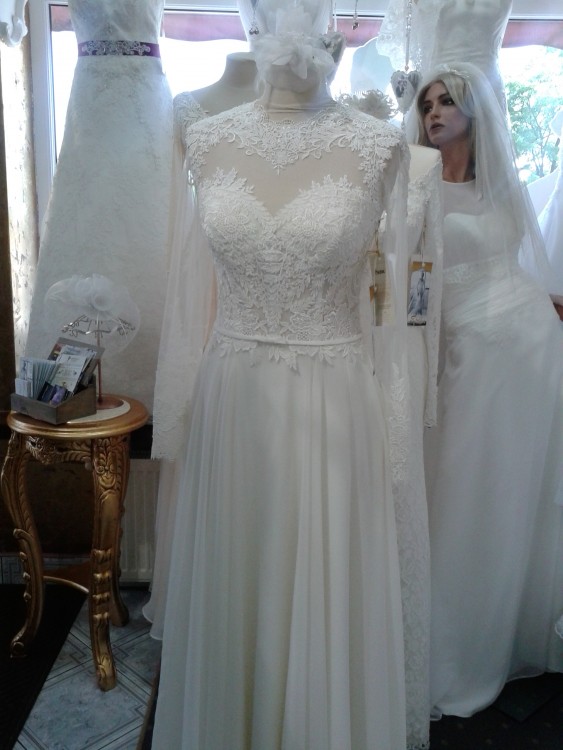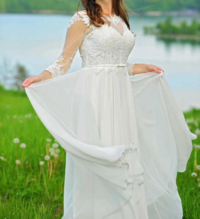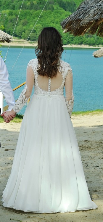 Wykonana z muślinu oraz bardzo eleganckiej koronki. Suknia jest niesamowicie wygodna, lekka, zwiewna, przepięknie układa się w tańcu.